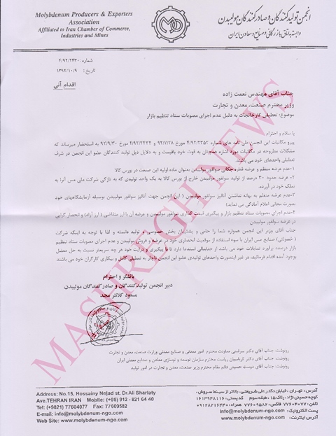 مسعود کلانتر مجد در ادامه این نامه یکی از علت های تعطیلی واحدهای این انجمن را عدم اجرای مصوبات ستاد تنظیم بازار و  پیگیری قیمت گذاری سولفور مولیبدن و عرضه آن با ارز متقاضی (ارز آزاد) و انحصارگرایی در عرضه این محصول می داند و از وزیر صنعت ،معدن و تجارت درخواست کرده تا با پیگیری و درایت خود،هر چه سریعتر نسبت به حل معضل بوجود آمده اقدام نماید.