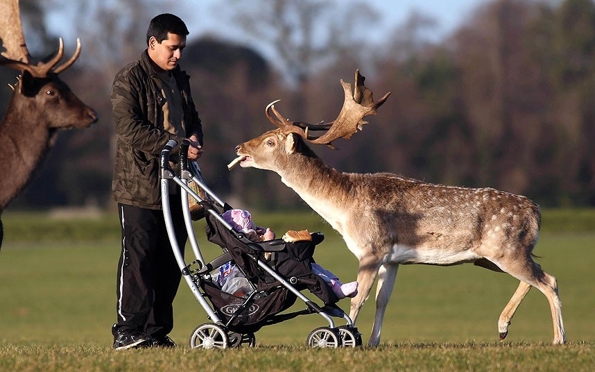 وی توضیح داد که مردی همراه با دختر کوچکش در گهواره در حال قدم زدن در پارک بود و به دخترش نان می داد اما در همین زمان گوزنی با نزدیک شدن به بچه، بالای سر وی قرار گرفت و یک تکه از نان وی را برداشت و خورد.