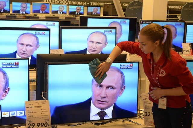یک مغازه تلویزیون فروشی در مسکو همزمان با نشست خبری زنده ولادیمیر پوتین