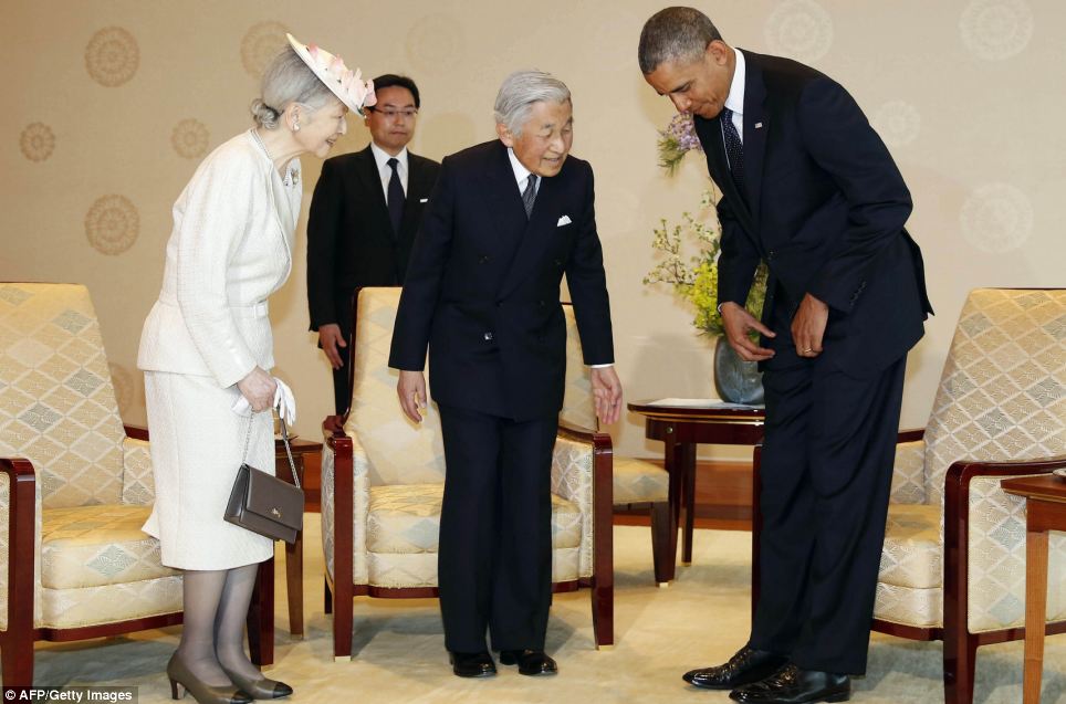اوباما ابتدا توسط دانش آموزان مورد استقبال قرار گرفت و بعد از وارد کاخ امپراطوری شد.