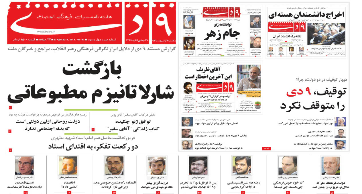 هفته نامه 9 دی بعد از توقیف کوتاه مدت خود امروز دوباره روی کیوسک های مطبوعات آمد.