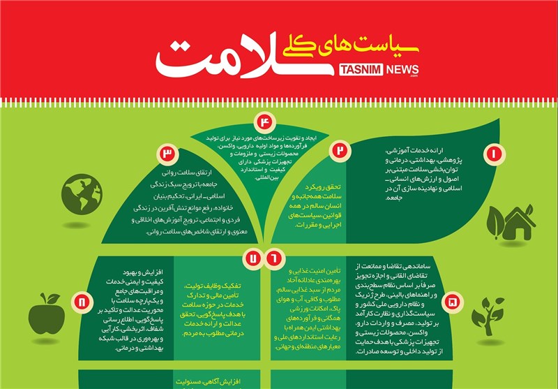 امام خامنهای در اجرای بند یک اصل 110 قانون اساسی سیاستهای کلی «سلامت» را که پس از مشورت با مجمع تشخیص مصلحت نظام تعیین شده است، ابلاغ کردند.