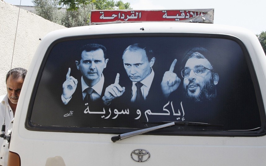 یک پوستر انتخاباتی حامیان بشار اسد رییس جمهور سوریه در شهر لاذقیه در پشت مینی بوسی نصب شده است. در این پوستر تصاویر سیدحسن نصرالله، ولادیمیر پوتین و بشار اسد در کنار یکدیگر دیده میشود.