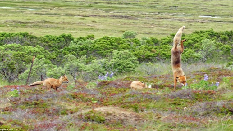 در این عکس روباهها در حال جست و خیز در پناهگاه ملی حیات وحش شبهجزیره آلاسکا هستند. این پارک سکونتگاه مهمی برای ماهیها و حیوانات وحشی مانند خرس قهوهای، موس و کاریبو (گونههای گوزن بومی آمریکای شمالی) گرگ، ولورین (نوعی راسوی بزرگ) و البته روباه است.