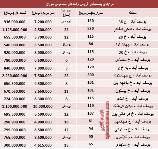 جدول/ قیمت آپارتمان در یوسفآباد تهران