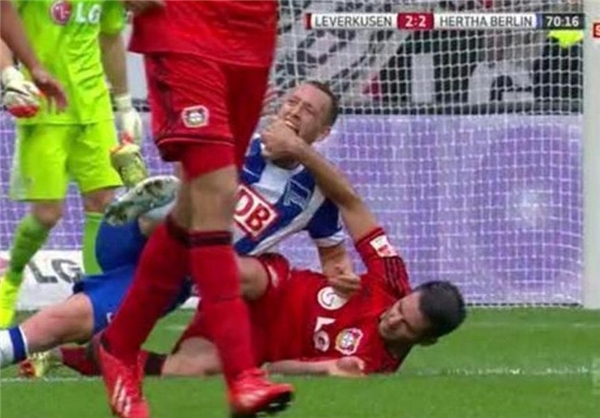 در دیدار تیمهای فوتبال هرتابرلین و بایر لورکوزن، جولیان شیبر بازیکن هرتا در جدال با نهون سپاهیچ در دقیقه 70 بازی، دست بازیکن بوسنیایی را گاز گرفت تا حرکت سوارس بار دیگر در یادها زنده شود. لورکوزن این بازی را با نتیجه 4 بر 2 به سود خود پایان داد.