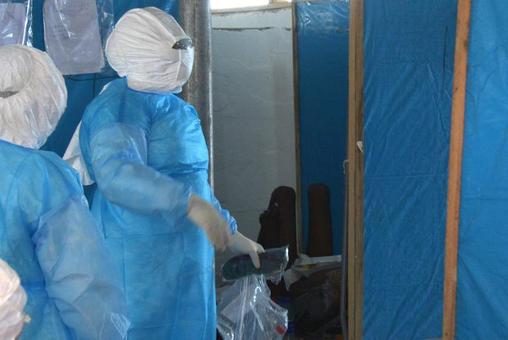 کادر پزشکی در بیمارستان جان اف کندی در مونرویا با پوشیدن لباسهای مخصوص ضد ویروس و محافظ در بیمارستانی که در آن بیماران مبتلا به ویروس ابولا درمان می شوند.