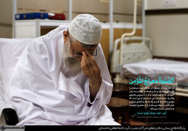 پایگاه اطلاعرسانی KHAMENEI.IR تصویر رهبر انقلاب اسلامی در حال اقامه نماز مغرب و عشا در بیمارستان را که مربوط به روز پنجشنبه ۱۳۹۳/۶/۲۰ است، منتشر کرد.