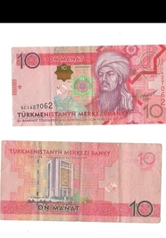 بر روی اسکناس 10 مناتی نیز تصویری از از «مختومقلی فراغی» شاعر معروف و کلاسیک ترکمن و نیز پشت روی این اسکناس عکس از ساختمان بانک مرکزی ترکمنستان به چشم می‌‏خورد.