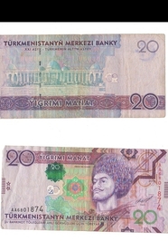اسکناس 20 مناتی با تصویر نقاشی «گوراوغلی بگ ترکمن» شخصیت افسانه‌ای ترکمن‌ها بوده و پشت آن نیز عکس «کاخ روحیت» عشق‌‏آباد جای داده شده‌‏ است.