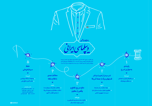 رهبر انقلاب در تاریخ ۹۳/۵/۲۲ یکی از اهداف مهم مسئولان امور خارجه را برجسته‌کردن ویژگی‌های دیپلماسی ایرانی دانستند. در این اینفوگرافیک پنج ویژگی اصلی دیپلماسی ایرانی که رهبر انقلاب در این دیدار بیان فرمودند مرور شده است.