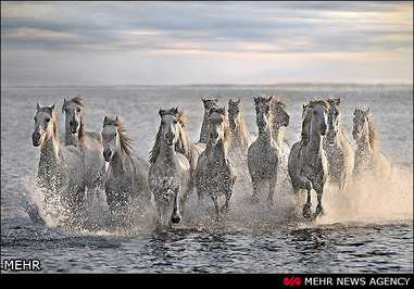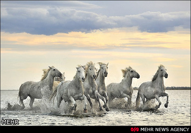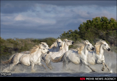 یک عکاس اسپانیایی عکس هایی بسیار زیبا را گرفته است که نشان می دهد گروهی از اسب های سفید کمیاب هنگام غروب، در طول رودخانه رون فرانسه، به صورت چهارنعل می تازند.