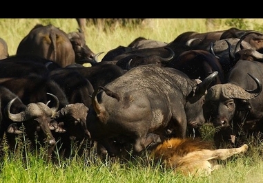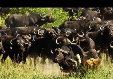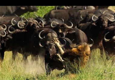 گروهی از گاو میشها با دنبال کردن شیری تنها به راحتی آن را غذای خود کردند.درمیان نزاع حیوانات همیشه شاهد پیروزی قویترین حیوان یعنی شیر همان سلطان جنگل قصهها بودهایم اما در اینجا شاهد هستیم که یک شیر تنها در چنگال گروهی از گاو میشهای وحشی گیر افتاده و غذای آنها میشود.
