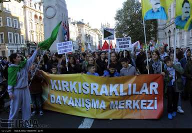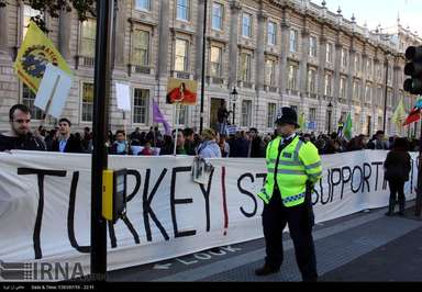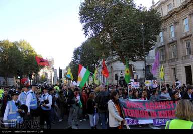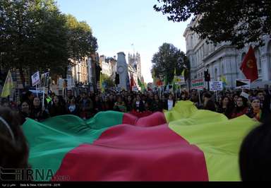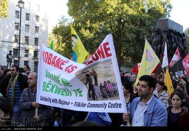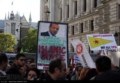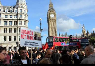 شمار زیادی از کردهای ساکن انگلیس عصر روز شنبه در اعتراض به حملات وحشیانه گروه داعش به شهر کوبانی در شمال سوریه و حمایت های ترکیه از این گروه تروریستی، در قلب لندن اقدام به تظاهرات کردند.عکس از ایرنا-دفتر لندن.
