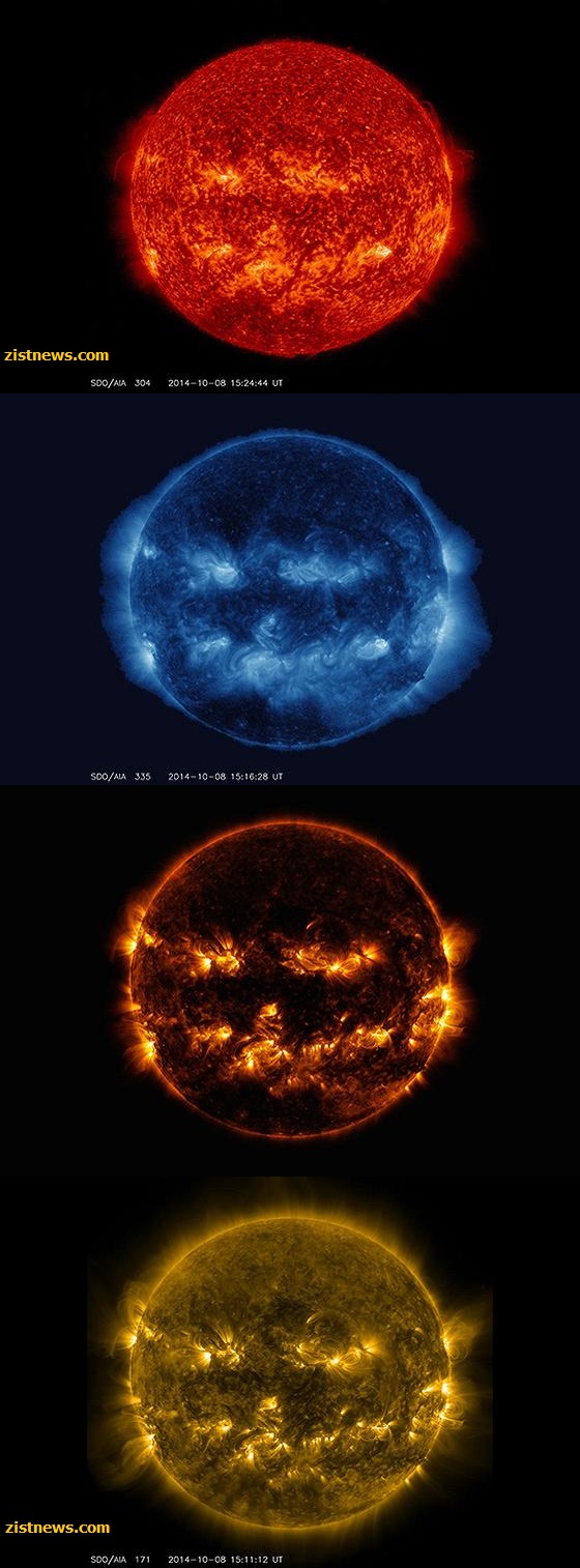 ناسا تصاویری استثنایی از خورشید را منتشر کرده که در 8 اکتبر 2014 توسط رصدخانه دینامیک خورشیدی گرفته شده است.در این تصاویر نواحی فعال اطراف خورشید باهم ترکیب شدند و تصویری شبیه به صورتک کدوتنبل هالووین، بر سطح خورشید ایجاد شده است