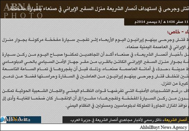 گروه تکفیری انصار الشریعه مسئولیت انفجار مقابل محل اقامت سفیر ایران در صنعاء را که به کشته و زخمی شدن ۱۸ تن منجر شد بر عهده گرفت.