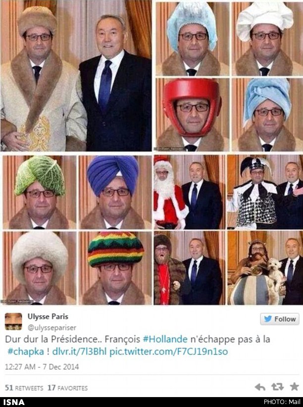 انتشار تصاویری از فرانسوا اولاند، رئیسجمهور فرانسه در کت و کلاه قزاقستانی در اینترنت موجب تمسخر وی در سراسر فرانسه شده است. به نوشته روزنامه دیلی میل، فرانسوا اولاند، رئیسجمهور فرانسه که تلاشش برای منتشر نشدن عکسهایش با نورالسلطان نظربایف، رئیسجمهور قزاقستان در لباس سنتی قزاقها ناکام مانده، اکنون به مضحکه اهالی فرانسه تبدیل شده است. لباس و کلاه پشمی اولاند هدیهای از جانب نظربایف بود که تصاویر دیدارش با اولاند را در صفحه اینستاگرام خود منتشر کرده بود. البته این عکسها بعد از مدت کوتاهی و بنا به خواسته اولاند از اینستاگرام حذف شد.
