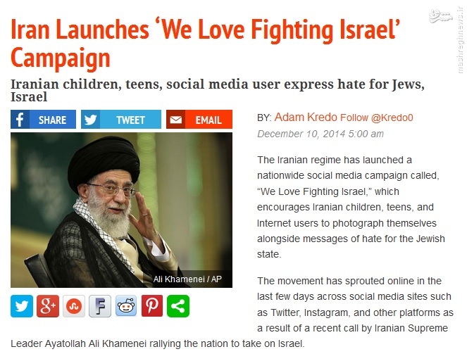 سایت آمریکایی فریبیکن در این باره نوشته است: نظام ایران یک کمپین سراسری در شبکههای اجتماعی با عنوان «من عاشق جنگ با اسرائیل [رژیم صهیونیستی] هستم» به راه انداخته که هدف از آن ترغیب کودکان، نوجوانان و کاربران اینترنتی برای ارسال تصاویر خودشان با پیامهای حاوی ابراز تنفر از رژیم صهیونیستی است. این جنبش طی روزهای اخیر در توییتر، اینستاگرام و سایر شبکههای اجتماعی رو به گسترش نهاده است.