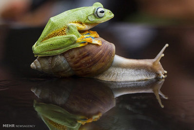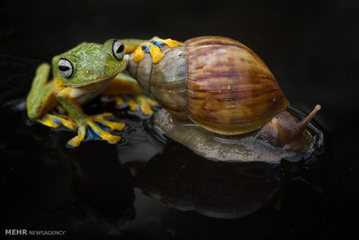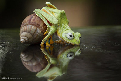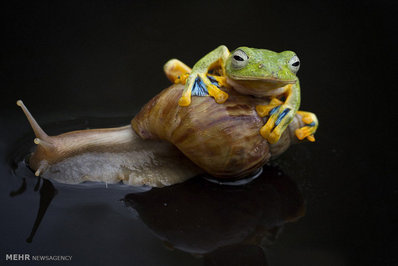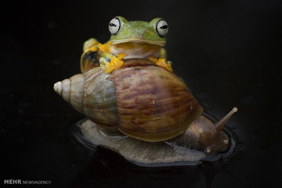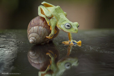 این تصاویر که توسط یک عکاس اندونزیایی در نزدیکی خانه اش گرفته شده نشان می دهد که چگونه یک قورباغه کوچک تلاش می کند از یک حلزون، سواری بگیرد.