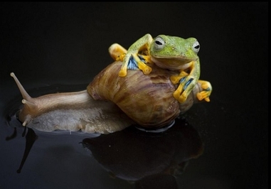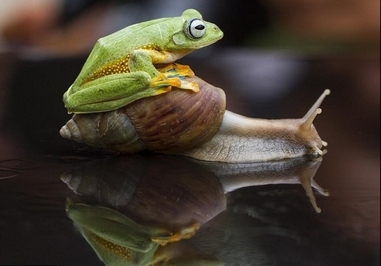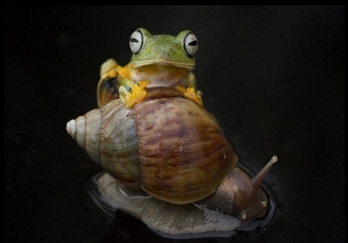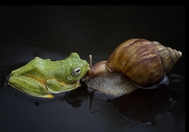 یک عکاس موفق شده است که تصاویر زیبا و در عین حال عجیب لحظات دوستی قورباغه و حلزون را با دوربین خود بگیرد. این تصاویر رفاقت قورباغه کوچک با حلزونی در منطقه آفریقا را نشان میدهد که به نظر خیلیها امر محالی میتواند باشد. این تصویر را «هندی» عکاس 25 ساله در نزدیکی خانهاش در «سمباس» واقع در اندونزی گرفته است . «هندی» فقط 30 سانتیمتر از این سوژه، فاصله دارد.