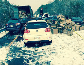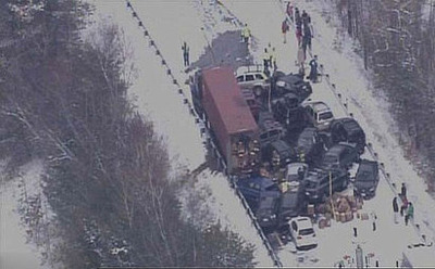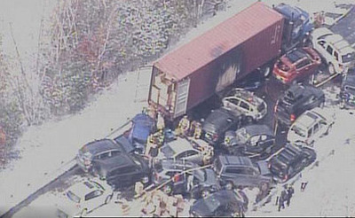 در دو تصادف زنجیره ای در ایالت نیوهمپشایر در آمریکا نزدیک به 100 خودرو به هم برخورد کردند.این حادثه در ساعت نه و چهل و پنج دقیقه صبح روز جمعه و به دلیل بارش برف و لغزندگی در لاین شمالی بزرگراهی در چهل و پنج کیلومتری شمال منطقه کنکورد در ناحیه اشلند در ایالت نیوهمپشایر روی داد. گزارش هاحاکی از این است که شمار زیادی در این تصادف زخمی شده اند که حال برخی از مجروحان حادثه وخیم گزارش شده است.