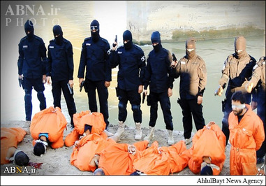 گروه تروریستی تکفیری داعش ۸ تن از جمله ۴ مامور پلیس شیعه را در استان صلاح الدین در شمال عراق اعدام کردند. در پیامی که به همراه این تصاویر منتشر شده، آمده که این افراد به اتهام ارتداد به اعدام محکوم شدهاند. این افراد با چشمان و دستان بسته به زیر یک پل که روی یک رودخانه قرار دارد برده میشوند و عناصر تروریستی نقابدار سیاهپوش از پشت سر سلاحهایشان را به سوی آنها نشانه گرفته و شلیک میکنند.
