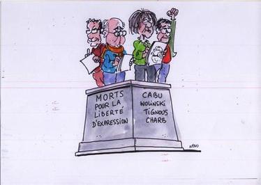 در همین راستا برخی روزنامهها با در دست گرفتن تابلویی با عنوان «شارلی ابدو» از این نشریه حمایت کردند و در نهایت اوج این واکنش از سوی کارتونستهای جهان نسبت به قتل عام پاریس رخ داده که با طرحهایی نیشدار و انتشار وسیع کارتنهایی که شمارشان از شب گذشته به چندصد کارتن میرسد، نسبت به کشتار همکارانشان واکنش نشان داد.