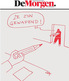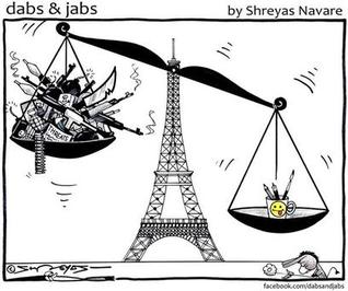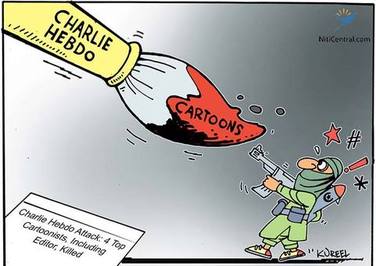 مداد و کلاشینکف دو نماد اصلی است که در بخش عمدهای از کارتونها به شیوههای مختلف به کار گرفته شده و کارتونیستها تلاش کردهاند برتری قلم را در جنگ با سلاح به تصویر بکشند و هزینه آنچه در پاریس رخ داد را برای عاملان چنین جنایتی افزایش دهند و در همین راستا به نظر میآید باید شاهد سیل کاریکاتورها با این مضمون باشیم.