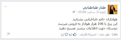 صراط: چند روز پیش مدیر یکی از صفحههای هواداری «طناز طباطبایی» بازیگر سرشناس ایرانی با آگهی جالبی اقدام به فروش این صفحه با حدود ۱۰۶ هزار طرفدار کرد. مدیر فعلی این صفحه از هواداران خواست تا در صورت تمایل به صورت خصوصی و از طریق پیام شخصی به این صفحه برای خرید و مطلع شدن از قیمت این صفحه اقدام کنند.