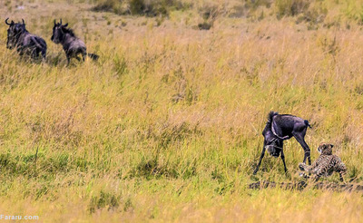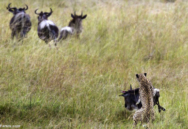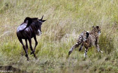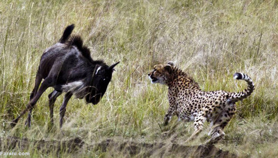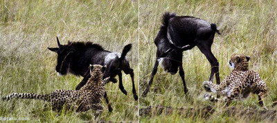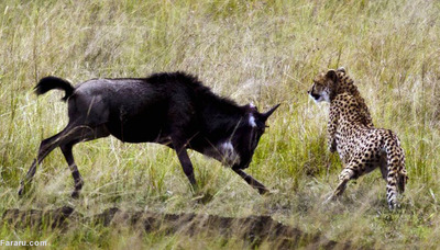 یوزپلنگ ماده ای که تصور می کرد گاو یالدار جوان را با یک حمله غافلگیر و شکار می کند خود از عکس العمل شکارش غافلگیر شد. گوزنیالدار یوزپلنگ را غافلگیر کرد"مانجو شاه" عکاس حیات وحش که برای عکاسی به پارک ملی "ماسایی مارا" در کنیا رفته بود به شکل غیرمنتظره ای توانست لحظات شگفت انگیز از حمله و گریز این یوزپلنگ ماده و یک گاو یالدار افریقایی را شاهد باشد و به تصویر بکشد.