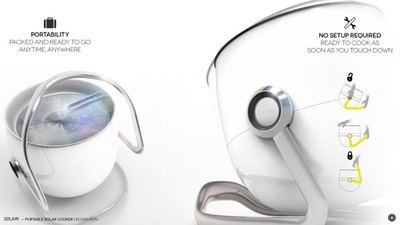 "بودین هون" قابلمه جدیدی را ابداع کرده است که می تواند شما را در همه جا همراهی کند بدون آنکه مشکل خاصی را به همراه داشته باشد چرا که غذای شما را با استفاده از نور خورشید درست می کند. این قابلمه آلودگی های محیطی را نیز بسیار کاهش می دهد. البته این نکته را نیز باید بدانید که این قابلمه از سلول های خورشیدی استفاده نمی کند. لنز خاصی در محل درب قابلمه قرار گرفته است و نور خورشید با تابیده شدن به آن منعکس شده و به فضای درون می رود و درآنجا باعث پخته شدن غذا می شود. این قابلمه تنها زمان آشپزی را کمی اضافه می کند.