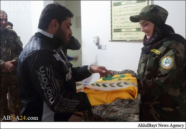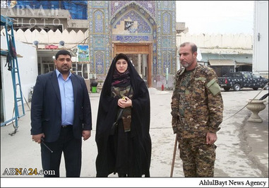 خانم دکتر ندی بدران از اساتید دانشگاه لبنان که به شهر مقدس سامراء سفر کرده است حرم مطهر امامین عسکریین(ع) را زیارت کرد. وی که با پوشیدن یونیفرم نظامی به حرمین مطهر امام هادی و امام حسن عسکری سلامالله علیهما مشرف شده بود با مسئولین گردانهای مردمی حضرت سیدالشهداء(ع) که وظیفه دفاع از حریم آل الله و حرم مطهر امامین عسکریین(ع) را در سامراء برعهده دارند دیدار کرد.این استاد دانشگاه در این دیدار از آمادگی خود برای مقابله با تروریستهای تکفیری و دفاع از مقدسات اسلامی سخن گفت.در این دیدار فرمانده مدافعان گردان حضرت سیدالشهداء(ع) پرچم این گردان را به خانم ندی بدران اهداء کرد.