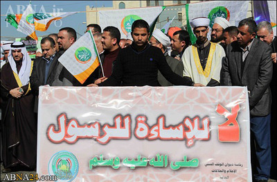 هزاران عراقی در اعتراض به انتشار کاریکاتورهای موهن به ساحت پیامبر اکرم (ص) در نشریه فرانسوی شارلی ابدو در بغداد تجمع اعتراض آمیز برپا کردنداین تجمع اعتراض آمیز به دعوت دیوان اوقاف اهل تسنن عراق و «محمود صمیدعی» رئیس این دیوان و شمار دیگری از علمای عراقی برگزار شد.اوقاف اهل تسنن عراق انتشار کاریکاتورهای موهن را جنگ صلیبی توصیف کرد و افزود این در حالی است که مسلمانان دشمن مسیحیان و یهودیان نیستند.
