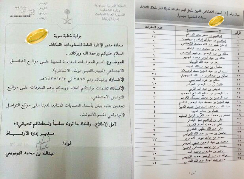 به گزارش وبسایت "حق"، همچنین در این اسناد فهرست اسامی افرادی که گفته می شود از اعضای اخوان المسلمین عربستان هستند و نیز فهرست اسامی مسافران 3 سال گذشته به قطر، وجود دارد.