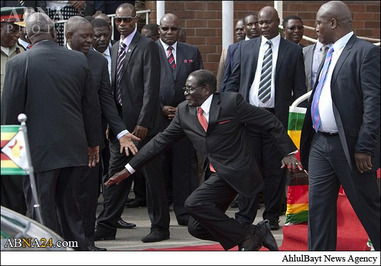 «رابرت موگابه» رئیس جمهور ۹۰ ساله زیمبابوه، روز چهارشنبه بعد از سخنرانی برای طرفدارانش در فرودگاه هراره از روی پلههای محل سخنرانی بر زمین افتاد.