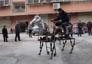 یک مرد چینی وسیله نقلیه عجیبی ساخته است که با استفاده از نفت قادر به حرکت است. «سو دائوچنگ» یک مرد 60 ساله چینی است که در شیان یک شهر روستایی در استان هوبئی در چین زندگی میکند؛ وی یک وسیله نقلیه به شکل اسب مکانیکی ساخته است که تقریباً شبیه چرخ دستیهای چوبی است. این اسب مکانیکی بسیار بزرگ دارای ارتفاع یک متر و 50 سانتیمتر، 2 متر طول و 250 کیلو وزن است؛ یک موتور کارتینگ دارد و سوخت آن نفت است. دو پای عقب اسب، مکانیکی است که دارای دو چرخ است و پاهای جلو فقط تزئینی هستند که مجهز به یک فرمان است و ابزار خاصی ندارد.