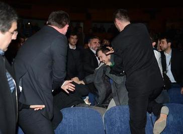 حاضران در مراسم 4 معترض را که به هنگام سخنرانی احمدی نژاد با اعتراض سعی در اخلال داشتند کتک زده و از سالن بیرون کردند. معترضان به سخنرانی احمدی نژاد در دست خود پرچم سوریه داشتند. پلیس ترکیه پس از بیرون برده شدن معترضان از سالن ترتیبات امنیتی و حفاظتی احمدی نژاد را افزایش داد.