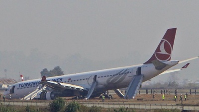 صبحِ امروز چهارشنبه هواپیمای ایرباس اِی 330 هواپیمایی "ترکیش ایرلاینز" به دلیل دید کم مجبور شد به مدت دو ساعت در آسمان فرودگاه بینالمللی "کاتماندو" (نپال) پرواز کند و در نهایت خارج از باند اصلی و در محوطه پوشیده از چمن این فرودگاه به زمین برخورد کرد. همه 224 نفر مسافر این هواپیما از به سلامت از هواپیما خارج شدهاند و تنها یک نفر از این مسافران دچار جراحتی سطحی شده است.علت احتمالی این حادثه شرایط جوی مهآلود گزارش شده که موجب شده است باند مرکزی به سختی دیده شود.سخنگوی هواپیمایی ترکیش ایرلاینز اعلام کرد تحقیقات در مورد علت دقیق حادثه در حال پیگیری است.