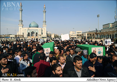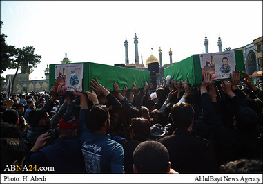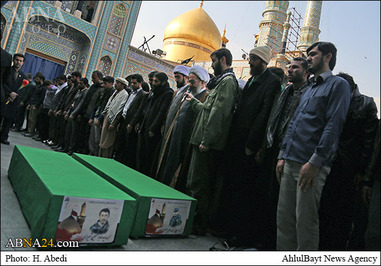 پیکر این دو شهید مدافع حرم پس از اقامه نماز میت در حرم مطهر بانوی کرامت به امامت آیت الله مقتدایی تشییع شد.