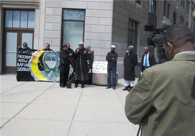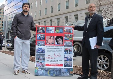 مسلمانان آمریکا پارچه نوشتههایی در دست داشتند که روی آن نوشته شده بود «عافیه صدیقی» را آزاد کنید.