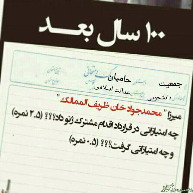 در شبکه های اجتماعی، در کنایه به توافق ژنو و تفاهم صورت گرفته در لوزان، عکسی منتشر شده است که سوال امتحانی صد سال بعد را در مورد ظریف الممالک نشان می دهد.