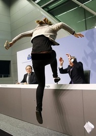صراط: یک دختر جوان در اقدامی اعتراض آمیز، بر روی میز رئیس بانک مرکزی اروپا پرید و بر سر او خرده کاغذ ریخت.