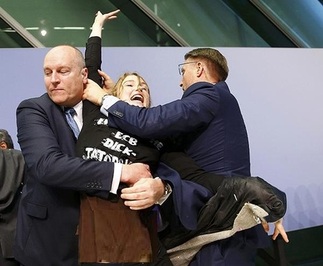 چند ثانیه بعد ماموران امنیتی مستقر در سالن برگزاری کنفرانس این معترض را دستگیر کردند.