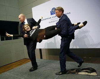 به گزارش عصرایران به نقل از یورونیوز، دختر جوانی با پریدن بر روی میزی که ماریو دراگی رئیس بانک مرکزی اروپا پشت آن مستقر بود در حالی که فریاد می زد «دیکتاتوری بانک مرکزی اروپا را متوقف کنید» بر روی رییس این نهاد کاغذهای تکه تکه شده ریخت.