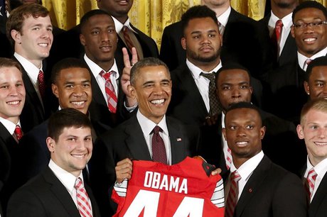 اعضای تیم قهرمان مسابقات دانشگاهی آمریکا به روال همیشه ضمن اهدای پیراهن تیم، عکسی دسته جمعی با رئیسجمهور گرفتند و مایکل بنت کاپیتان تیم با شاخ گذاشتن برای اوباما این عکس را خاطرهانگیزتر کرد.
