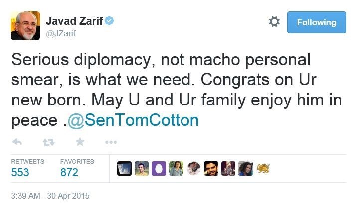 محمد جواد ظریف، وزیر امور خارجه کشورمان، در پاسخ به توئیتهای کینهتوزانه و بغضآلود تام کاتن، سناتور ضدایرانی کنگره آمریکا، نوشت: