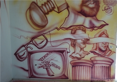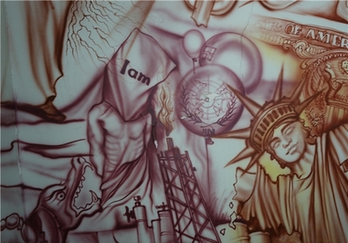 کلاوس تیمان در ادامه نوشت: و اما در بخشی دیگر شاهد مجسمه آزادی با ستارهها و خطوط راه راه در حال سوختن بودم که در کنارش یک اسرائیلی با بینی بزرگی مشاهده می شدند و البته یک هواپیمای در حال سقوط به سمت 2 آسمان خراش نیز وجود داشتند. در این تصویر عقاب آمریکا، چشم ایزدی و... وجود داشتند و البته تصاویر تبلیغاتی دیگری که در طبقات پخش بودند.