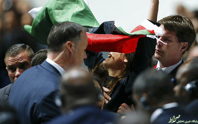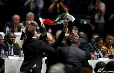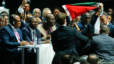 دو زن معترض فلسطینی که به عضویت اسراییل در فدراسیون بین المللی فوتبال اعتراض داشتند انتخابات ریاست این فدراسیون را مختل کردند.روز گذشته و در ابتدای نشست فیفا دو زن فلسطینی با نشان دادن کارت قرمز و سر دادن شعار «اسراییل را بیرون کنید» اعتراض خود را به عضویت اسرائیل در این فدراسیون اعلام کردند. این دو زن با در دست داشتن پرچم فلسطین به چنین اقدامی دست زدند.این در حالی است که قبل از آغاز نشست ۱۵۰ معترض فلسطینی بیرون از «هالن اشتادیون» زوریخ که کنگره فیفا در آن در حال برگزاری است، شعارهایی مبنی بر اخراج اسراییل از فیفا سر دادند.