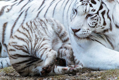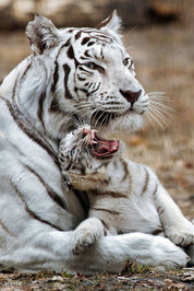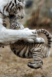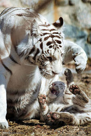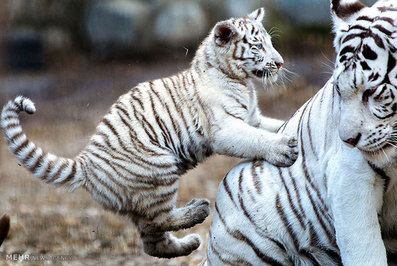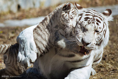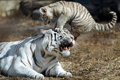 یک ببر سفید بنگال در باغ وحش نووسیبیرسک روسیه در حال بازی با توله اش است.