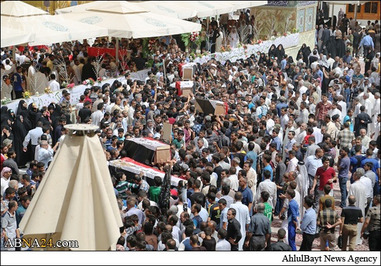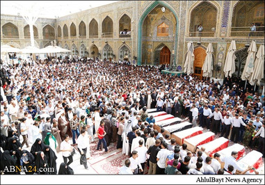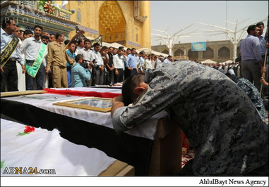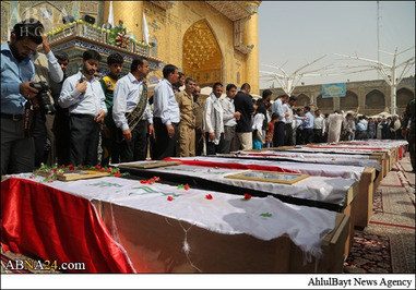 پیکر ده ها شهید از نیروهای نظامی عراق در حرم امام علی(ع) در شهر نجف اشرف تشییع و پس از آن، این پیکرها برای تدفین به قبرستان وادی السلام منتقل شد. بیش از چهل تن از نیروهای مردمی از شهر تلعفر روز گذشته ـ دو شنبه 11 خردادماه ـ در عملیات انتحاری داعش در استان الانبار عراق به شهادت رسیدند. یک عامل انتحاری داعش دیروز با یک نفربر بمب گذاری شده مقر پلیس و ارتش عراق را در منطقه «ثرثار» استان الانبار هدف قرار داد که به شهادت و مجروحیت ده ها تن از نیروهای مردمی عراق منجر شد.